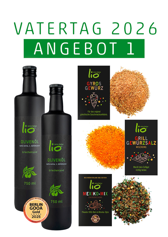 2 Flaschen lio-Olivenöl (750 ml), 1x Grill-Gewürzsalz Mischung (100g), 1x Gyros Gewürz (100g) und 1x Mexiko-Mix (100g) zum Vatertags-Aktionspreis!